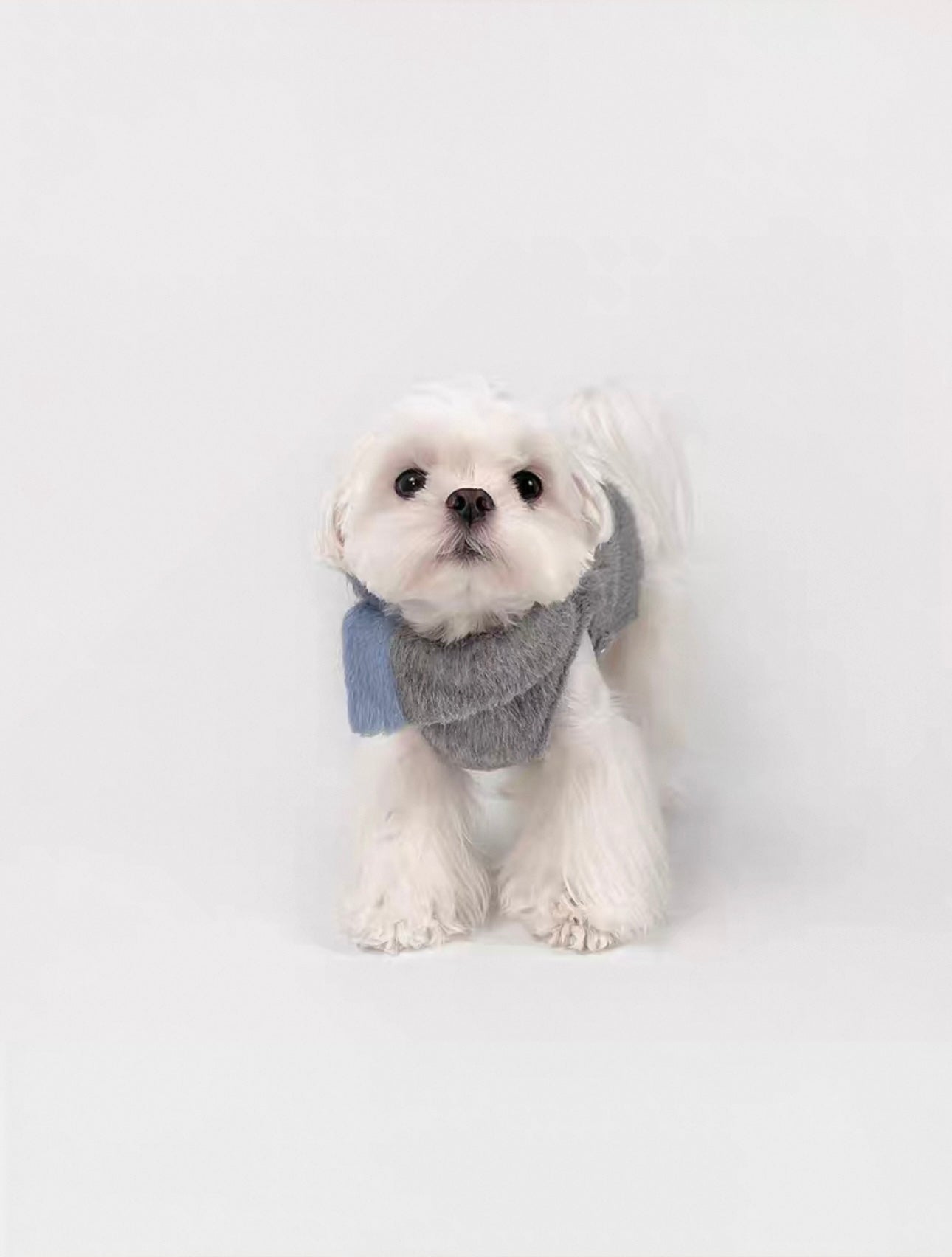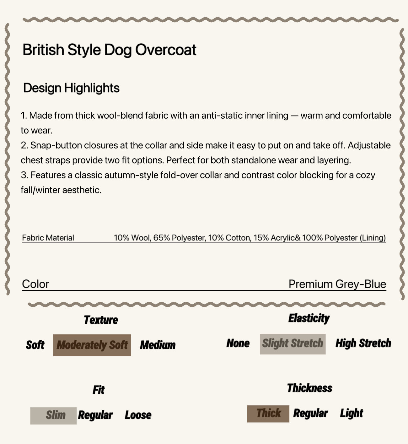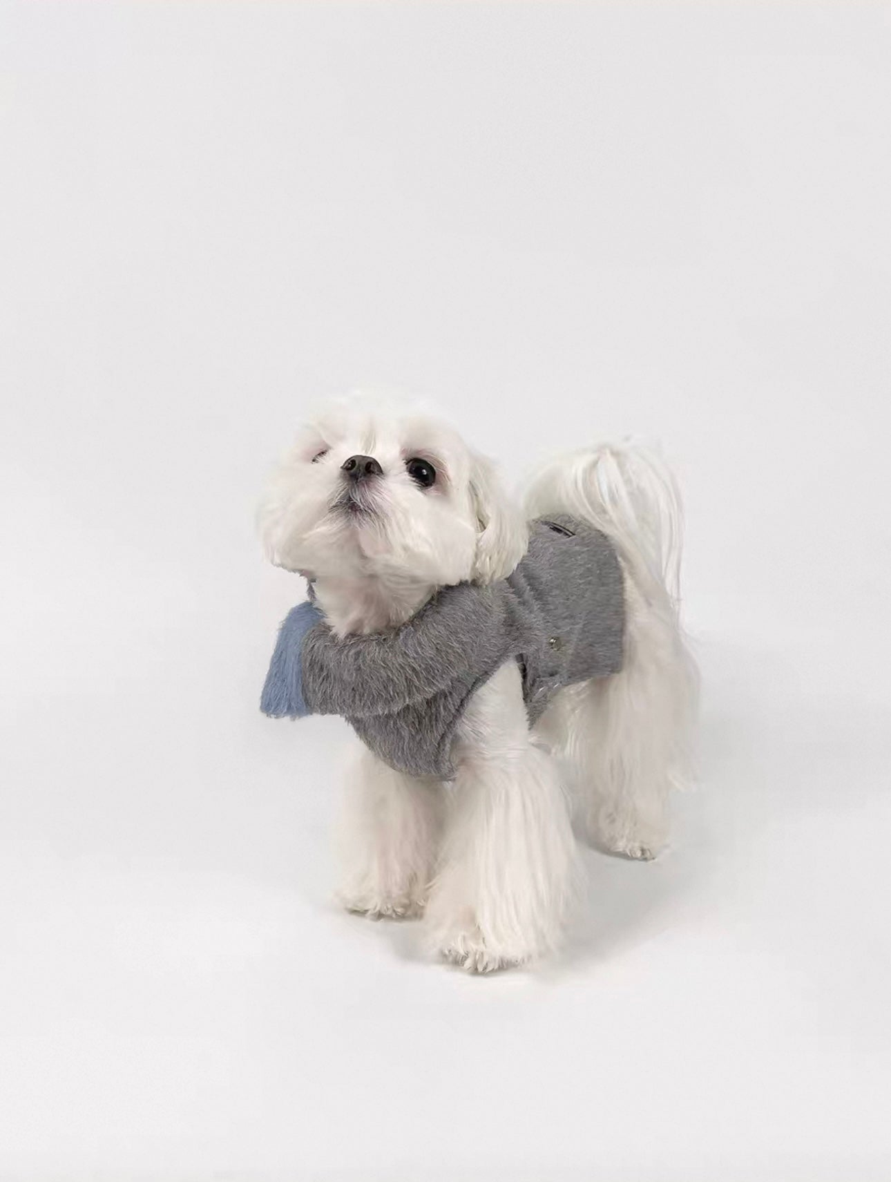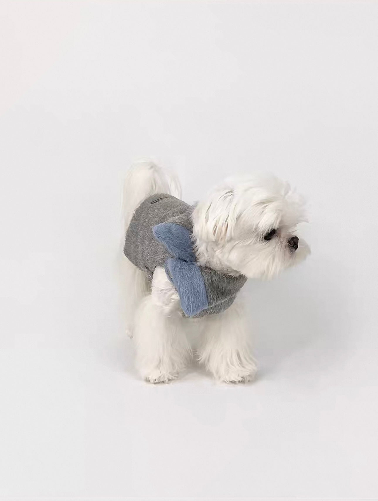 Add a touch of timeless elegance to your pup’s winter wardrobe with the British Style Dog Overcoat. Crafted from a soft wool-blend fabric in a neutral grey tone, this coat features a classic folded collar and a plush faux fur bow in muted blue — the perfect blend of function and charm.