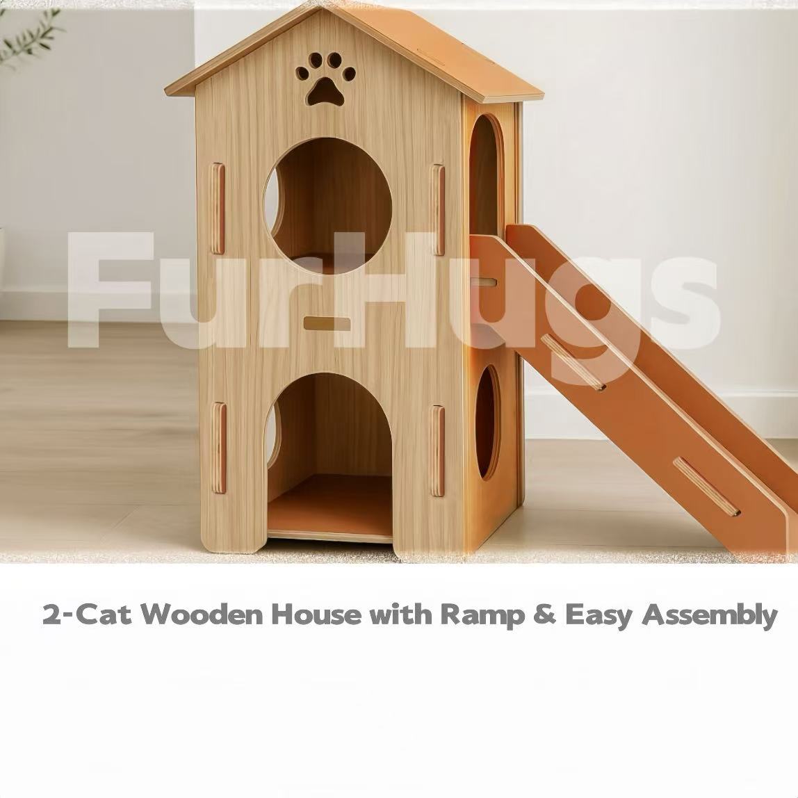 FurHugs ClimbCabin – Two-Story Wooden Cat House with Ramp & Cushions