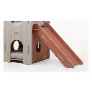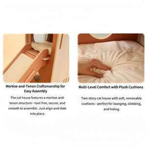 The FurHugs ClimbCabin™ is a thoughtfully crafted two-story wooden cat house that combines cozy hideouts with playful features. Built with a traditional mortise-and-tenon structure for stability and easy tool-free assembly, it includes plush cushions and a gentle slide-inspired ramp to invite cats of all ages to climb, lounge, and explore.