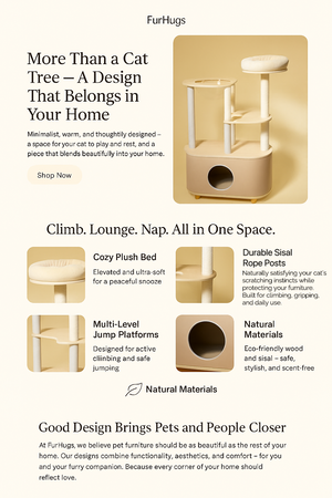The FurHugs Hide & Climb Cat Tree is thoughtfully designed with soft plush resting spots, sturdy sisal scratching posts, and multiple levels to climb, jump, and explore.