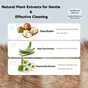 🌿 Natural Plant Formula – Enriched with shea butter, aloe vera, and chamomile extract to soothe, moisturize, and soften fur.
