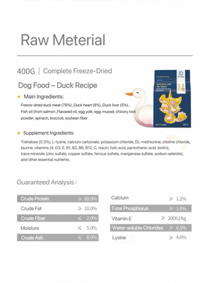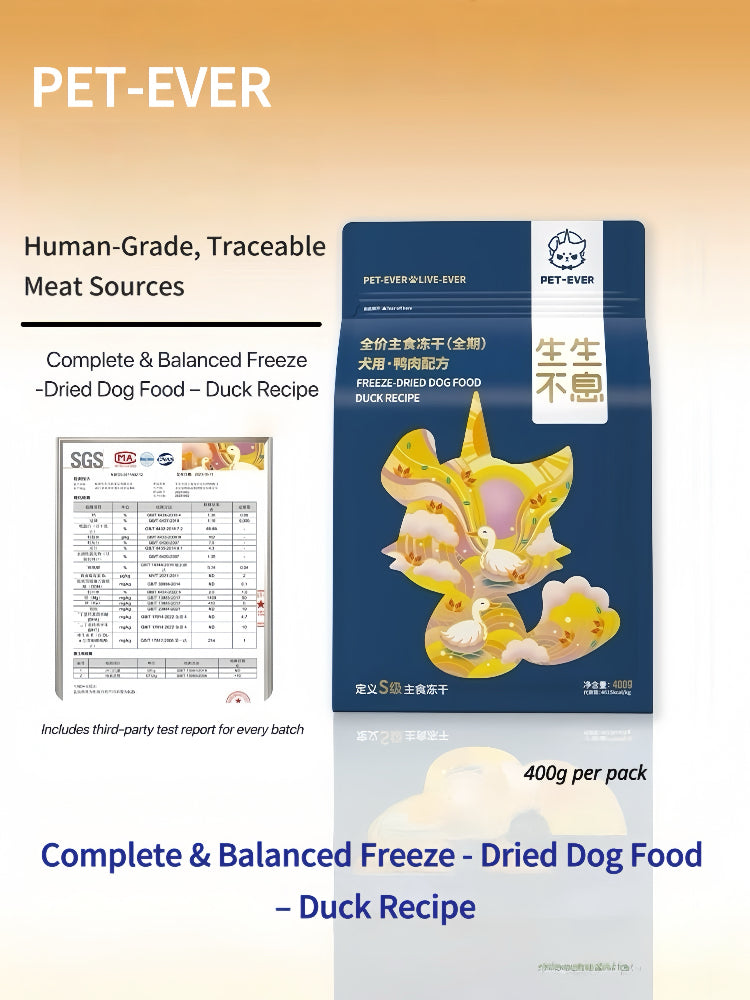 Premium freeze-dried dog food made with human-grade duck meat, PET-EVER’s “Live-Ever” formula provides complete, balanced nutrition for dogs of all life stages. Designed to meet S-level standards across eight key health indicators, this duck recipe is ideal for puppies and adult dogs, especially those with sensitive stomachs.