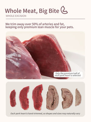 Support your pet’s heart health and shiny coat with PET-EVER’s Freeze-Dried Pork Hearts — a protein-rich, single-ingredient snack made from premium lean pork hearts. Each piece is hand-trimmed to remove over 50% of fat and arteries, ensuring your cat or dog enjoys only clean, dense muscle meat.