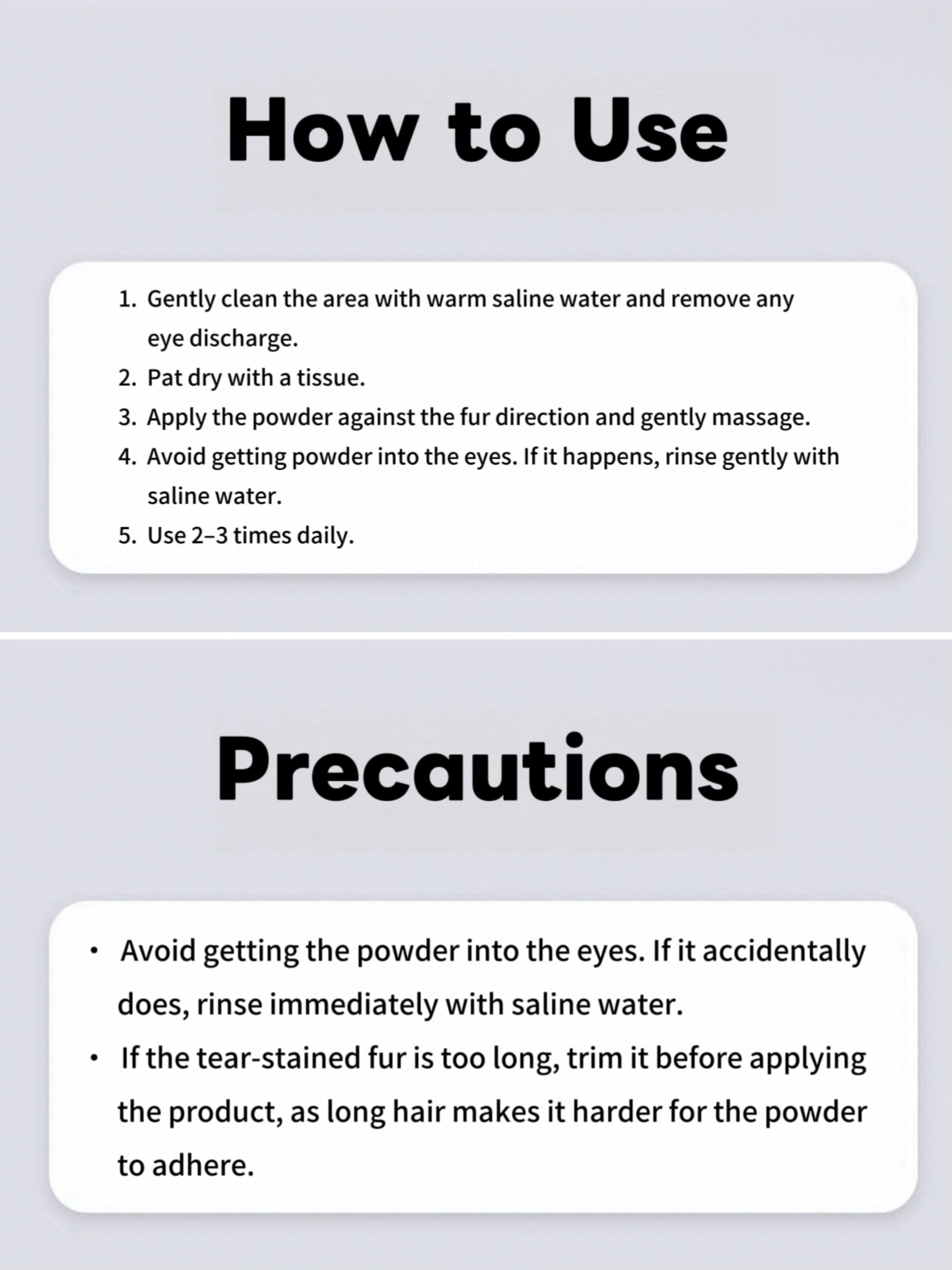 Clean the area with warm saline water, pat dry, apply the powder against the fur direction, and gently massage. Avoid direct contact with eyes.